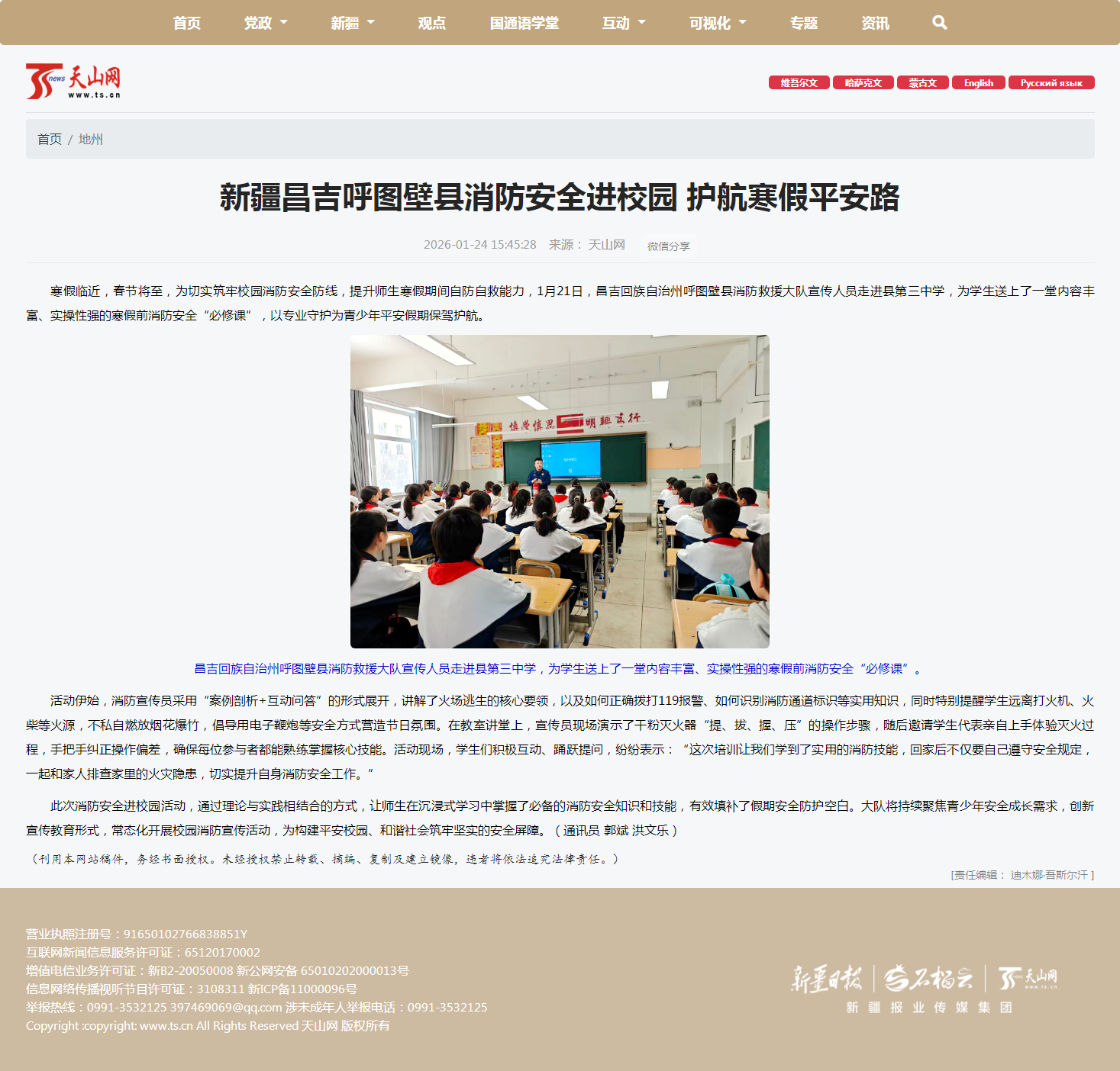 天山网:新疆昌吉呼图壁县消防安全进校园 护航寒假平安路